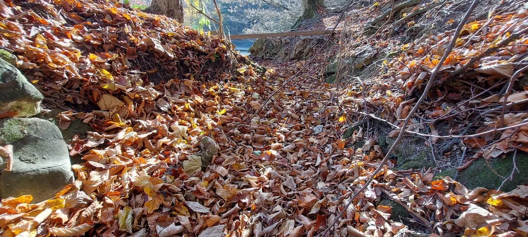 Szomorú látvány fogadja a látogatókat: kiszáradt a szilvásváradi Fátyol-vízesés, falevelek borítják a patakmedret.